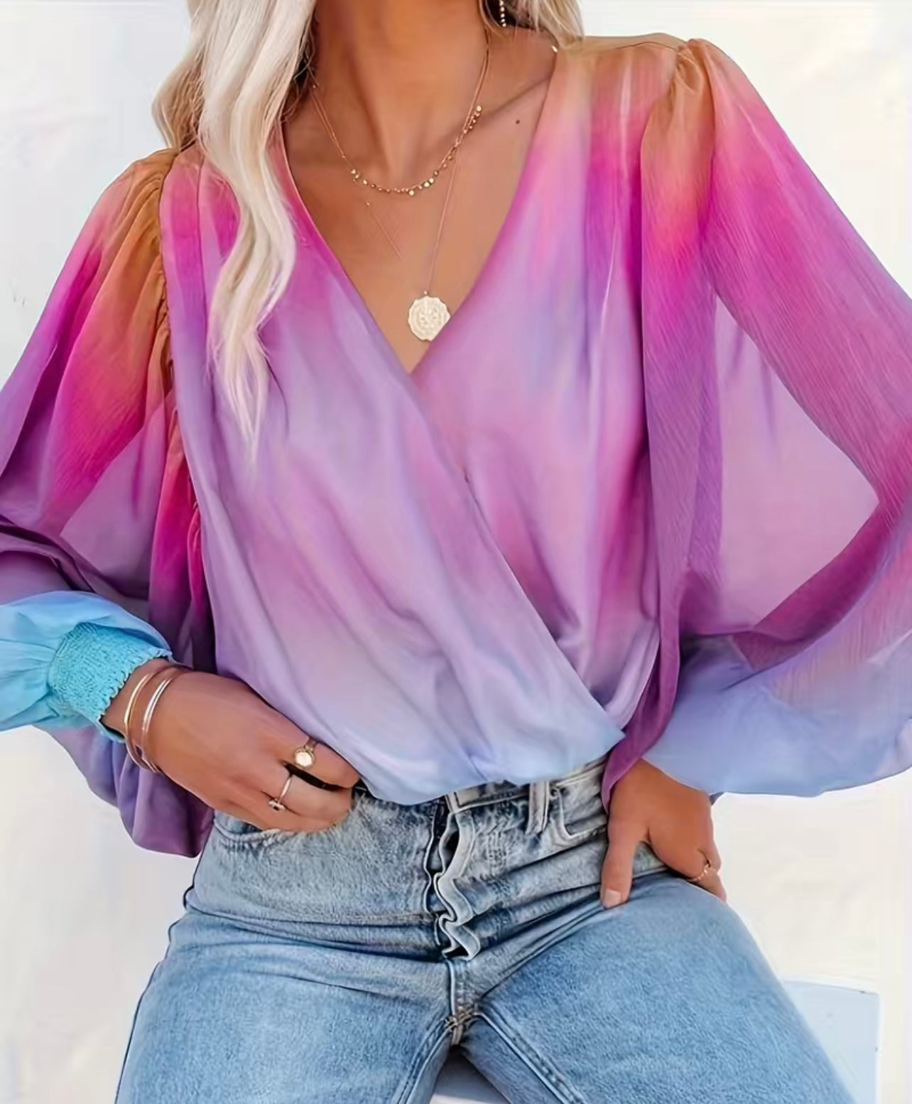 Expertly crafted with a chic ombre design, this lightweight blouse will elevate any outfit. The flattering v-neck and elastic waist add shape and comfort to your look. Perfect for any occasion, this blouse is a must-have for any fashion-forward wardrobe.